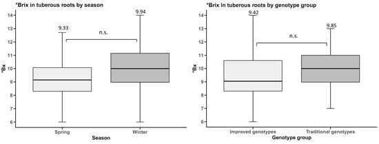 °Brix in sweet potato tuberous roots (n = 20 cultivars × 5 replicates) by planting season and by genotype group. n.s.: not significant.
