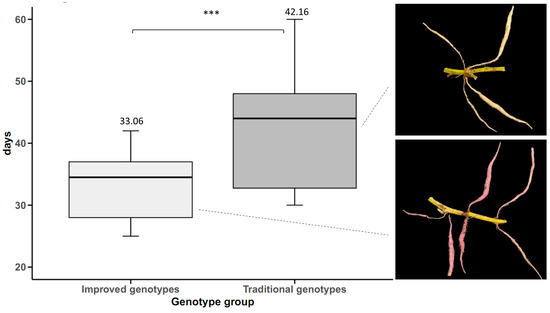 Storage roots initiation in sweet potato (n = 20 cultivars × 5 replicates) by genotype groups. *** p < 0.001.