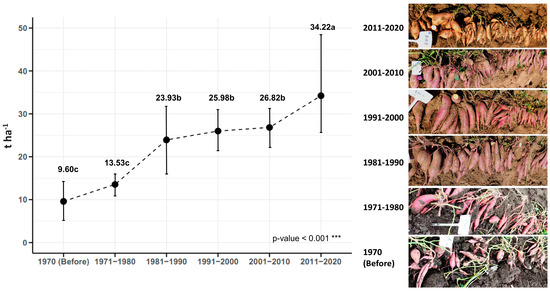 Sweet potato tuberous roots yield (n = 24 cultivars × 5 replicates) over time, by decades, based on the year of release of the genotypes. Different letters (a, b, c) indicate statistically significant differences (p < 0.001).