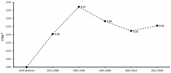 Traditional sweet potato cultivars used in Cuba before 1970 had an average yield of 9.60 t ha−1. A slight increase in yield (3.93 t ha−1) was observed in the decade of 1971–1980, which reached 13.53 t ha−1. A considerable increase in yield was obtained with the improved genotypes of the decade of 1982–1990, which had an average yield of 23.93 t ha−1. Compared with the traditional genotypes, the increase was 14.33 t ha−1. In the decades of 1991–2000 and 2001–2010, there was no considerable increase in yield compared with the decade of 1981–1990. It was only in the decade of 2011–2020 that there was a significant increase in this characteristic (34.22 t ha−1) compared with the previous decades. Therefore, it can be said that for the improved genotypes of the last decade (2011–2020), compared with the genotypes before starting the genetic improvement program (traditional genotypes), the yield has had an improvement progress of 24.62 t ha−1, meaning that the yield in Cuba has increased by 256% in the last 50 years due to plant breeding (Figure 8).