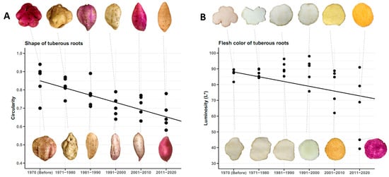 Shape of tuberous roots (n = 24 cultivars × 3 replicates) expressed in circularity (A), and flesh color (B), by decades, depending on the year of release of the genotypes.