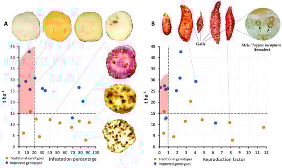 Selection of genotypes (n = 20 genotypes × 3 replicates) according to independent criteria (yield and percentage of infestation by weevil) (A) and selection of genotypes according to independent criteria (yield and reproduction factor of M. incognita) (B).