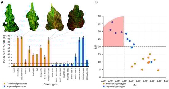 Incidence of sweet potato viral disease in 20 sweet potato genotypes (traditional and improved) (n = 20 genotypes × 3 replicates) (A) and selection of genotypes according to independent criteria with drought tolerance indices (MP and SSI) (B).