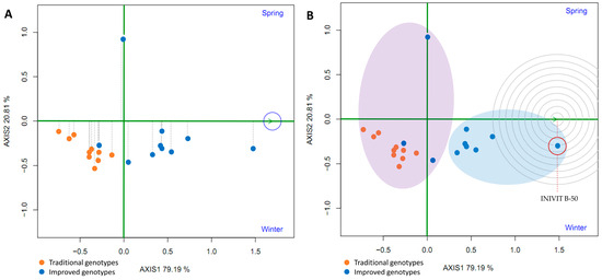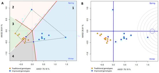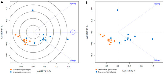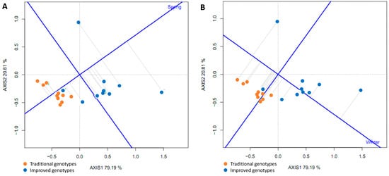 The genotypes (traditional and improved) and the environments (spring and winter) were plotted in a GGE biplot. All genotypes (except one) were below the horizontal center line, suggesting higher yields in winter and lower yields in spring. Nine improved genotypes had an angle between the genotype vector and the environment vector (spring) of less than 90° (acute angle), indicating that they yielded more than the average of all genotypes in spring. The traditional genotypes and one improved genotype were below the average in spring (obtuse angles). Furthermore, the group of traditional genotypes was located opposite the spring season, suggesting that this season is not suitable for planting this type of genotype (Figure 13A,B).