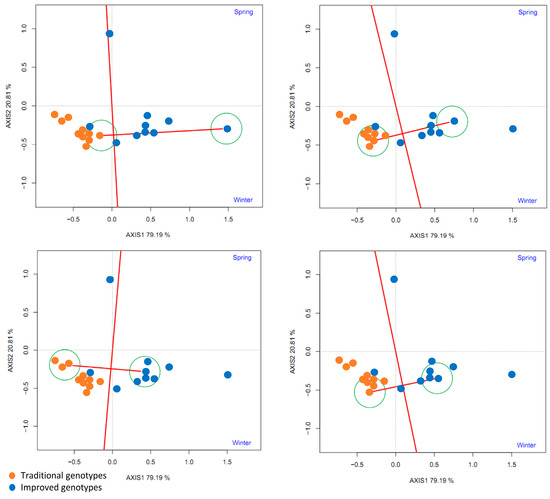 To compare some traditional varieties with improved varieties, a line was drawn connecting them and another perpendicular to it passing through the origin of the biplot. The two environments (spring and winter) are located to the right of the perpendicular, as are most of the improved cultivars (8–9), indicating that the improved cultivars (80–90%) had higher yields than the traditional cultivars in both environments (Figure 15).