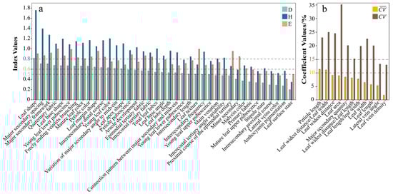 Diversity and variability analysis of leaf phenotypic traits in Malus germplasm. (a): the bar plot of Simpson’s Diversity Index (D), the Shannon–Wiener Information Index (H), and the Evenness Index (E) for qualitative traits. If the values of D are ≥0.50, H are ≥0.80, and E are ≥0.60, the trait is considered to meet the required criteria; (b) the bar plot of the mean coefficient of variation () and the coefficient of variation () for quantitative traits. If is ≤10% and is ≥15%, the trait is considered to meet the required criteria.