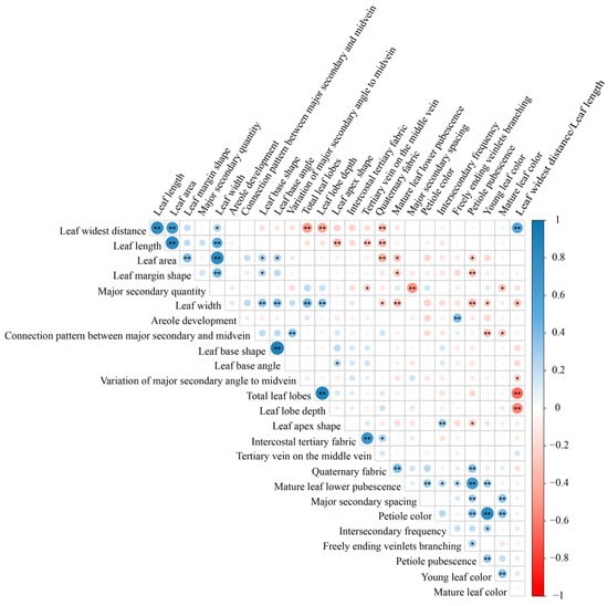 Pearson correlation analysis of leaf phenotypic traits in Malus. Note: ** indicates significant correlation at the 0.01 level (two-sided), and * indicates significant correlation at the 0.05 level (two-sided). Blue dots indicate positive correlations, red dots indicate negative correlations, and the size of the dots represents the magnitude of the correlation coefficient.