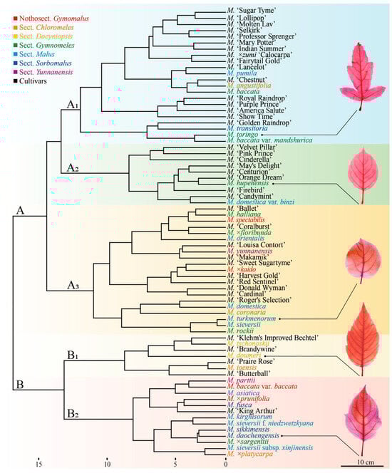 The distribution of these seven sections across the two major clusters (A and B) was relatively balanced, accounting for 55.9% and 44.1%, respectively. Within the five subgroups, the species were predominantly distributed in A3 (32.4%) and B2 (35.3%). Specifically, Sect. Docyniopsis was found exclusively in subgroup B1, while Sect. Yunnanensis was evenly distributed between A3 (50%) and B2 (50%). Sect. Sorbomalus showed an uneven distribution, with 25% in A1 and 75% in B2. Sect. Chloromeles was evenly distributed across four subgroups (A1, A3, B1, and B2, each 25%). Sect. Malus exhibited an uneven distribution, with 10% in A1, 10% in A3, 40% in B1, and 40% in B2. Sect. Gymnomeles was unevenly distributed across A1 (37.5%), A2 (12.5%), A3 (37.5%), and B2 (12.5%). Finally, Nothosect. Gymomalus was evenly distributed between A3 (50%) and B2 (50%).