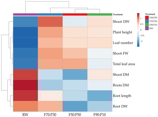 From the observation of the heatmap (x-axis, Figure 1), the clustering of the treatments reveals that RW formed a distinct cluster. Plants grown with RW exhibited a higher germination percentage, as well as increased dry matter content in both shoots and roots. In contrast, the Coconut-Perlite treatment formed a separate cluster, with the F70:P30 treatment showing, in order of proximity, the highest germination percentage compared to the other two treatments, along with longer roots and greater dry weight. Additionally, the F50:P50 and F90:P10 treatments generated a subcluster primarily characterized by lower germination activity and reduced root development.