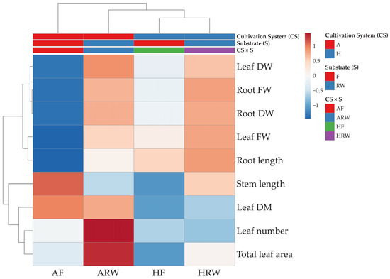 Cluster heatmap analysis illustrating morpho-anatomical parameters of lemon basil (Ocimum × citriodorum) plants grown on two different substrates: 70% coconut fiber mixed with 30% perlite (F) and 100% rock wool (RW) and in two different cultivation systems, hydroponic (H) or aquaponic (A). Rows represent the measured parameters (e.g., leaf number, total leaf area, root length, flavonoid index), and columns represent each combination of substrate and cultivation system. Color intensity reflects standardized values (ln(x + 1) transformed), with red indicating higher-than-average values and blue indicating lower-than-average values. Hierarchical clustering was conducted using Euclidean distances and complete linkage.