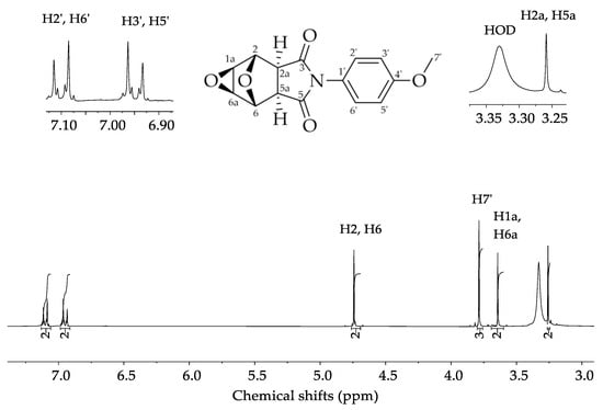 (1aR,2R,2aR,5aS,6S,6aS)-4-(4-methoxyphenyl)hexahydro-3H-2,6-epoxyoxireno[2,3-f]isoindole-3,5(4H)-dione (19). White solid. TLC: Rf = 0.33 (hexane/ethyl acetate 1:2 v/v). mp: 251.9–252.4 °C; 98% yield. IR (ATR, ῡ/cm−1): 2961, 1776, 1706, 1512, 1393, 1248, 1181, 1018, 862, 799, 762, 624, and 516. 1H NMR (300 MHz, DMSO-d6, and CDCl3); δ: 3.25 (2H, s, H2a, and H5a); 3.61 (2H, s, H1a, and H6a); 3.79 (1H, s, and H7’); 4.74 (2H, s, H2, and H6); 6.85–7.00 (2H, m, H3’, and H5’); 7.05–7.19 (2H, m, H2’, and H6’). 13C NMR (75 MHz, DMSO-d6, and CDCl3); δ: 47.9 (C7’); 49.9 (C2a and C5a); 55.8 (C1a and C6a); 76.6 (C2 and C6); 114.0 (C3’ and C5’); 124.6 (C2’ and C6’); 128.3 (C1’); 159.6 (C4’); 175.4 (C3 and C5).