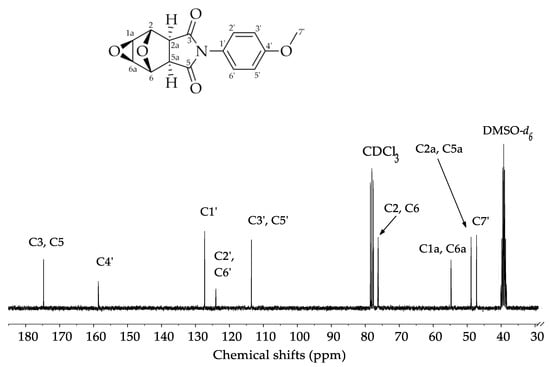In the 13C NMR spectrum (Figure 3) there is a signal at δ = 175.40 ppm attributed to the carbonyl carbons, C3 and C5. The signal at δ = 159.60 ppm was assigned to the olefinic carbon of the aromatic ring, C4’. The signals at δ = 128.30 ppm, δ = 124.60 ppm, and δ = 114.00 ppm are attributed to the other aromatic ring carbons C1’, C2’/C6’, and C3’/C5’, respectively. The signal observed at δ = 76.61 ppm was assigned to the carbons C2 and C6, bound to the bridge oxygen atom. The signal at δ = 55.80 ppm was assigned to the carbons C1a and C6a. Another signal at δ = 49.90 ppm was assigned to the carbons C2a and C5a. Finally, the most shielded signal, at δ = 47.90 ppm, was assigned to the methyl group carbon C7’.