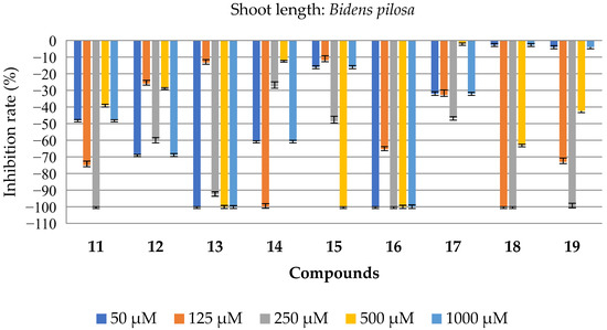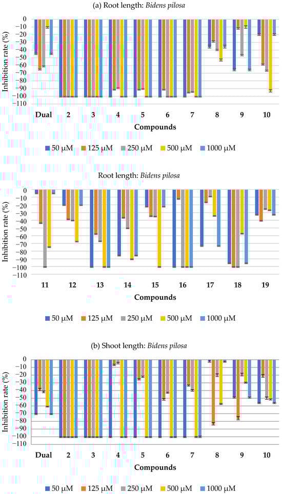 The substances 2–19 inhibited the growth of both the aerial and root parts of B. Pilosa (Figure 4). Substances 2–7, 13, and 16 achieved 100% inhibition of both the aerial and root growth at concentrations of 500 and 1000 μM. Compound 11 stood out, at a concentration of 250 μM, by showing 100% inhibition of both the aerial and root parts. Compound 18 showed 100% inhibition of the aerial and root parts at concentrations of 125 and 250 μM. The results are superior to those presented by the commercial herbicide (Dual) at the same concentrations. The tables with all the bioassay results for this species are available in the Supplementary Materials (SM, Tables S1 and S2).