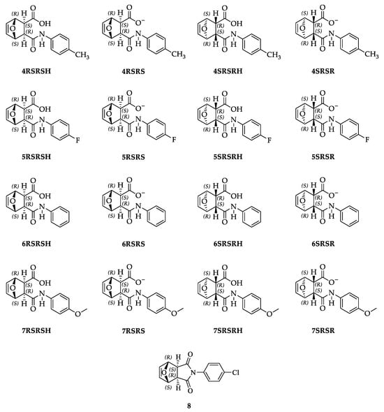 rac-(1R,2S,3R,4S)-3-((4-methoxyphenyl)carbamoyl)-7-oxabyciclo[2.2.1]hept-5-ene-2-caboxilic acid (7). White solid. TLC: Rf = 0.23 (hexane/ethyl acetate 1:2 v/v). mp: 142.6–143.8 °C; 92% yield. IR (ATR, ῡ/cm−1): 3310, 2824, 1720, 1653, 1553, 1508, 1368, 1029, 910, 832, and 491. 1H NMR (300 MHz, DMSO-d6); δ: 2.60 (1H, d, J = 6.0 Hz and H2); 2.71 (1H, d, J = 6.0 Hz, H3); 3.65 (3H, s, and H7’); 4.95–4.97 (1H, m, and H1); 5.06–5.08 (1H, m, and H4); 6.39–6.44 (2H, m, H5, and H6); 6.75–6.94 (2H, m, H3’, and H5’); 7.27–7.44 (2H, m, H2’, and H6’); 9.50 (1H, s, and OH). 13C NMR (75 MHz, DMSO-d6, δ = 40.0 ppm); δ: 46.72 (C2); 47.37 (C3); 55.22 (C7’); 79.09 (C4); 80.53 (C1); 113.78 (C3’ and C5’); 120.85 (C2’ and C6’); 132.45 (C5 and C6); 136.67 (C1’); 155.16 (C4’); 169.09 (C3a); 172.80 (C2a).