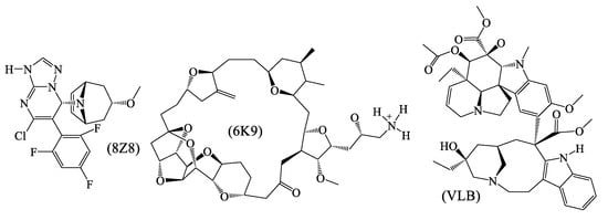Chemical structures of compounds that inhibit tubulin through complexation to site C of the protein: vinblastine (VLB; [64]), (1R,3R,5S)-8-[(7S)-5-chloro-6-(2,4,6-trifluorophenyl)-3H,7H-[1,2,4]triazolo[1,5-a]pyrimidin-7-yl]-3-methoxy-8-azabicyclo[3.2.1]oct-6-ene (8Z8; [77]), and eribulin (6K9; [78]).