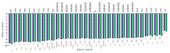 Therefore, it is likely that the above-mentioned compounds can also inhibit tubulins produced by Allium spp., Cucumis spp., Lactuca spp., and Triticum spp. Consequently, the tubulins selected in the pharmacophoric search, as well as others structurally similar to them, were used as models to study the interactions of the substances mentioned above with the tubulins produced by species of the mentioned plant genera. It was observed, for sites B and D of tubulins, that the aforementioned compounds present affinity values for the protein that is intermediate in relation to the values calculated for tubulin inhibitors (Figure 10). Therefore, it seems reasonable to suggest that such compounds may in fact be inhibitors of tubulin through the formation of complexes with the B site of such proteins.