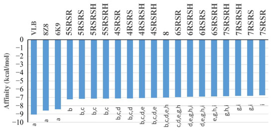 Affinities of the compounds studied in the present work (Scheme 1) and of the tubulin inhibitors (Figure 9) for tubulin site C, according to calculations carried out with the QuickVina 2.1 [79]. Columns with at least one identical letter are statistically equal according to the Conover test (p < 0.05).
