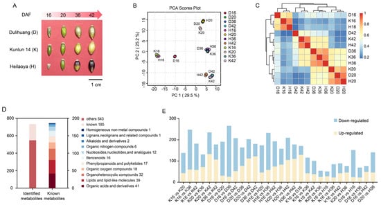 Qingke seed morphology and metabolite analysis at four key developmental stages (I, II, III, and IV): (A) Grain phenotype. (B) PCA of metabolomic data from four developmental stages and 36 qingke samples. (C) Hierarchical clustering analysis of metabolite distribution profiles of Dulihuang, Kunlun 14, and Heilaoya at four developmental stages. The color scale 0−1 represents Spearman’s correlation coefficient. (D) Numbers and classification of the identified and annotated metabolites. (E) Statistics of differentially accumulated metabolites, including upregulated and downregulated metabolites, in each comparison group.