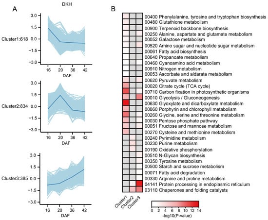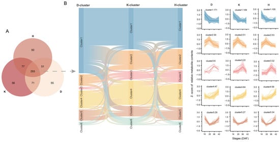 Cluster analysis of the accumulation patterns of the shared DAMs in Dulihuang, Kunlun 14, and Heilaoya: (A) Venn diagram of the DAMs in each of the three cultivars. (B) Distribution patterns of 293 metabolites at four seed developmental stages.