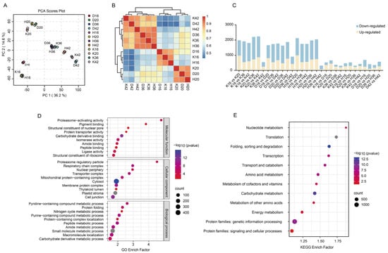 Protein identification and analysis: (A) PCA of proteomic data from four developmental stages and 36 qingke samples. (B) hierarchical clustering analysis of the protein expression profiles of Dulihuang, Kunlun 14, and Heilaoya at four developmental stages. The color scale 0−1 represents Spearman’s correlation coefficient. (C) statistics of the differentially expressed proteins, including upregulated and downregulated proteins, in each comparison group. (D) Top 10 GO terms of each category for the recognized proteins in the proteome. (E) KEGG pathway enrichment of the identified proteins. The enrichment factor is the percentage of members out of the total number detected. The bubble size represents the number of members detected in the KEGG pathway, and the color of the bubble represents the −log 10 (p value).