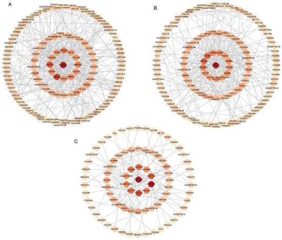 PPI networks of the DEPs: (A) Dulihuang vs. Kunlun. (B) Dulihuang vs. Heilaoya. (C) Kunlun 14 vs. Heilaoya. The circles represent the DEPs in each comparison, and darker colors indicate greater connectivity.