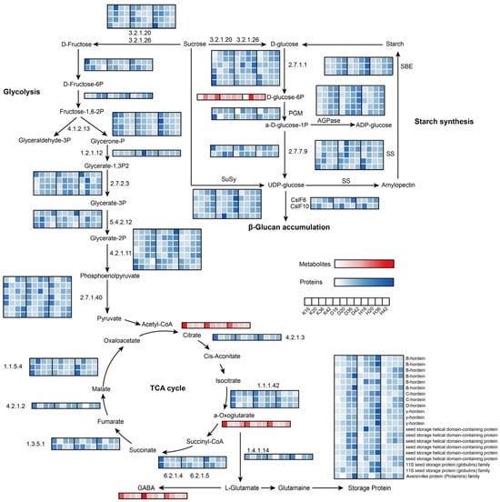 Visualization of the metabolites and proteins in biochemical pathway maps related to carbohydrate metabolism and energy metabolism in developing qingke seeds. Z score fold change values are shown on a color scale that is proportional to the abundance of each metabolite and protein. 3.2.1.20, maltase-glucoamylase; 3.2.1.26, beta-fructofuranosidase; 4.1.2.13, fructose-bisphosphate aldolase; 1.2.1.12, glyceraldehyde 3-phosphate dehydrogenase; 2.7.2.3, phosphoglycerate kinase; 5.4.2.12, 2,3-bisphosphoglycerate-independent phosphoglycerate mutase; 4.2.1.11, phosphopyruvate hydratase; 2.7.1.40, pyruvate kinase; 4.2.1.3, aconitate hydratase; 1.1.1.42, isocitrate dehydrogenase; 6.2.1.4, 6.2.1.5, succinyl-CoA synthetase alpha subunit; 1.3.5.1, succinate dehydrogenase; 4.2.1.2, fumarate hydratase; 1.1.5.4, malate dehydrogenase; 2.7.1.1, hexokinase; PGM, phosphoglucomutase; AGPase, ADP-glucose pyrophosphorylase; 2.7.7.9, UDP-glucose pyrophosphorylase; CslF6, cellulose synthase-like F6; CslF10, cellulose synthase-like F10; SS, starch synthase; SBE, starch branching enzyme.