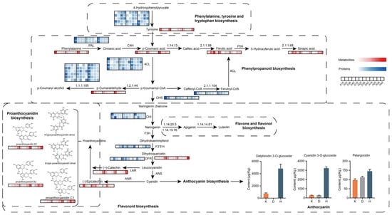 Visualization of the metabolites and proteins in biochemical pathway maps related to flavonoid biosynthesis in developing qingke seeds. The heatmap was plotted using normalized expression values of metabolites and proteins with Z scores. Total anthocyanin content in the three cultivars at 42 DAF. PAL, phenylalanine ammonia-lyase; C4H, 4-hydroxylase; 4CL, CoA ligase; 1.2.1.44, cinnamoyl-CoA reductase; 1.1.1.195, cinnamyl-alcohol dehydrogenase; CHS, chalcone synthase; CHI, chalcone isomerase; F3H, flavanone 3-hydroxylase; F3′5′H, flavonoid 3′,5′-hydroxylase; DFR, dihydroflavonol-4-reductase; LAR, leucoanthocyanidin reductase; ANS, anthocyanidin synthase; ANR, anthocyanidin reductase; 1.14.13.-, p-coumaroyl-CoA: caffeoyl-CoA 3-hydroxylase; 2.1.1.68, caffeic acid 3-O-methyltransferase; F5H, flavanone 5- hydroxylase; 2.1.1.104, caffeoyl-CoA O-methyltransferase; 1.14.20.5, flavone synthase I; 1.14.19.76, flavone synthase II; 1.14.14.81, flavonoid 3′,5′-hydroxylase.