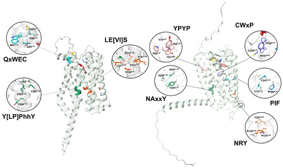 Among the transmembrane domains, TM3 was the most conserved in sequence, while TM6 showed the lowest, with no fully conserved residues across the sequences analyzed. Tryptophan residues in the extracellular half of TM2, TM3, and TM5 were 100% conserved in the studied sequences (Figure S2). In sequences from seed plants, ICL1 contained a conserved S711.66At and ICL3 was the largest intracellular loop, enriched in proline with a conserved region LPx[RK] (Figure S2). Interestingly, within ECL2, a highly variable region, only a F1715.38 was found to be conserved across all the protein sequences studied.