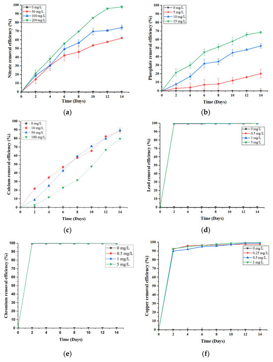 Figure 1d–f). All heavy metals showed a rapid rise in removal efficiency within the first two days, irrespective of the initial concentration. Notably, Pb