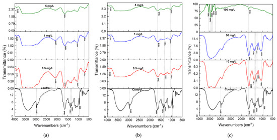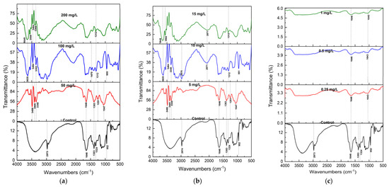 In control samples, the FTIR spectrum displayed characteristic features of plant biochemical constituents. A broad band centered at 3350 cm