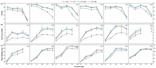 | Year | Treatments | Tillering Stage | Jointing Stage | Heading Stage | Filling Stage | Maturity Stage |