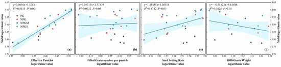 | Year | Treatment | Effective Panicles (104·ha−1) | Filled Grain Number per Panicle | Seed Setting Rate (%) | 1000-Grain Weight (g) |