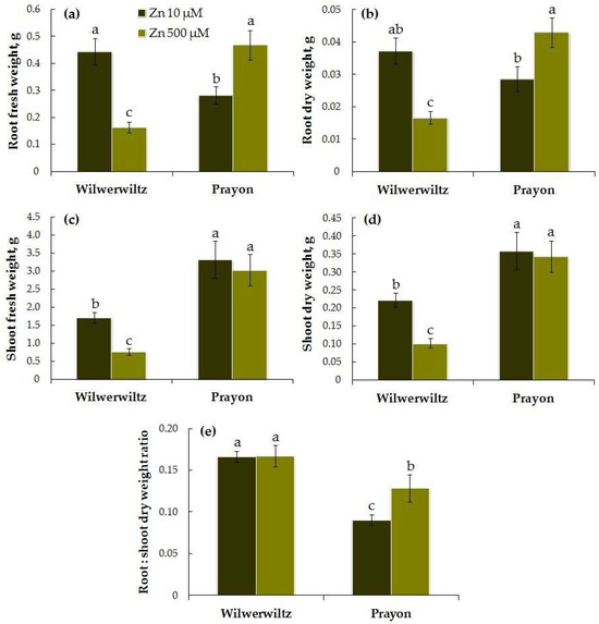 Figure 1. Root fresh (a) and dry weights (b), shoot fresh (c) and dry weights (d), and root–shoot dry weight ratio (e) after 2 months of Zn treatment of Noccaea caerulescens (Wilwerwiltz and Prayon populations) (means ± SEs, n = 9). Values assigned with different letters indicate a significant difference between the means (two-way ANOVA followed by post hoc Tukey’s HSD test, p ≤ 0.05).
