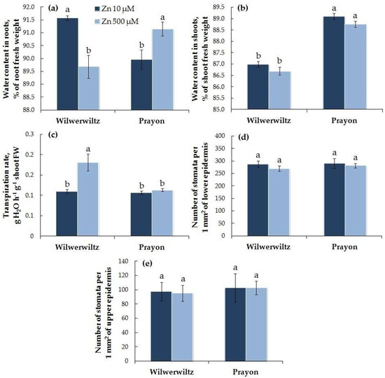 Figure 2. Water contents in roots (a) and shoots (b), transpiration rate (c), and the number of stomata per unit leaf blade area (1 mm2) for the lower epidermis (d) and upper epidermis (e) after 2 months of Zn treatment of Noccaea caerulescens (Wilwerwiltz and Prayon populations) (means ± SEs, n = 9). Values assigned with different letters indicate a significant difference between the means (two-way ANOVA followed by post hoc Tukey’s HSD test, p ≤ 0.05).