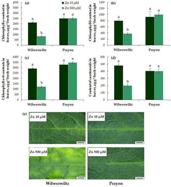 Figure 3. Contents of chlorophyll a (a), chlorophyll b (b), chlorophyll a+b (c), and total carotenoids (d) in leaves, as well as leaf blade microphotographs (e) after 2 months of Zn treatment of Noccaea caerulescens (Wilwerwiltz and Prayon populations) (means ± SEs, n = 9). Values assigned with different letters indicate a significant difference between the means (two-way ANOVA followed by post hoc Tukey’s HSD test, p ≤ 0.05). Bar, 2 mm (e).