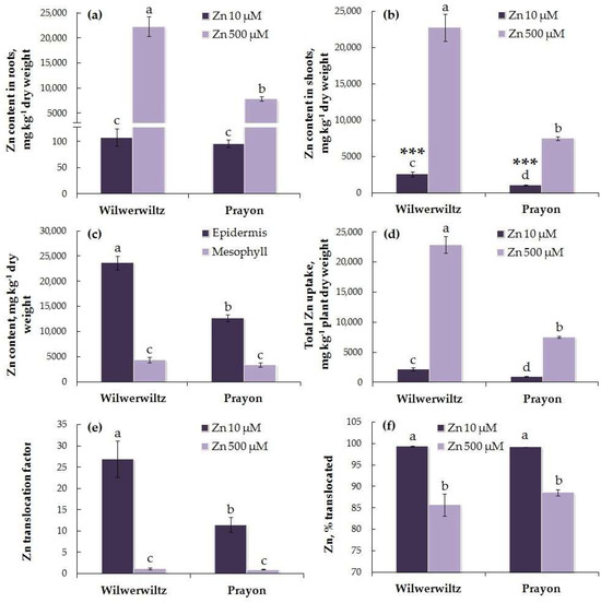 Figure 4. Zinc contents in the roots (a), shoots (b), leaf epidermis and mesophyll (c), total Zn uptake (d), Zn translocation factor (e), and % translocated (f) after 2 months of Zn treatment of Noccaea caerulescens (Wilwerwiltz and Prayon populations) (means ± SEs, n = 9). The Zn contents in the leaf epidermis and mesophyll (c) were only assessed at 500 µM ZnSO4. Values assigned with different letters indicate a significant difference between the means (two-way ANOVA followed by post hoc Tukey’s HSD test, p < 0.05). Significant differences between the Zn contents in roots and the Zn contents in shoots are marked by asterisks (one-way ANOVA, p ≤ 0.001).