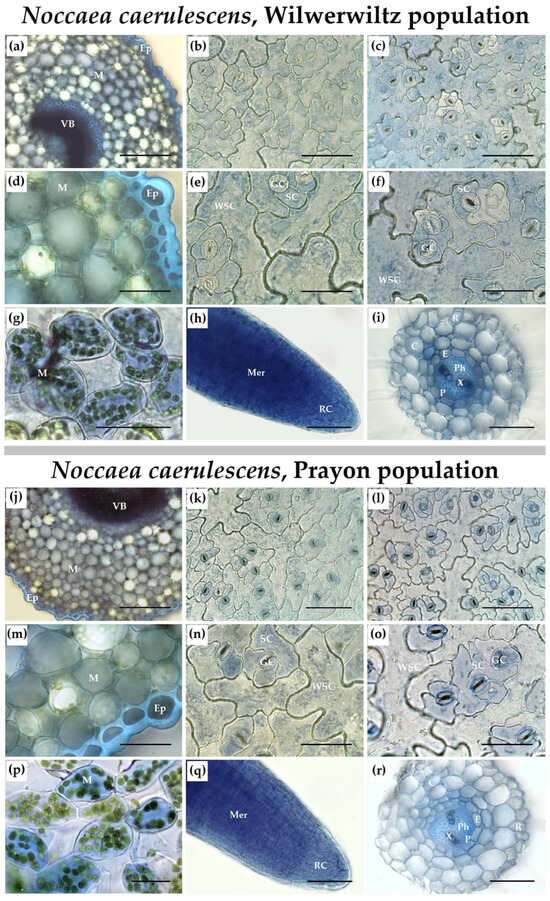 Figure 5. Distribution of Zn over the shoot (ag,jp) and root (h,i,q,r) tissues after 2 months of Zn treatment of Noccaea caerulescens (Wilwerwiltz (ai) and Prayon (jr) populations) with 500 µM Zn. Each picture is a representative selection of six plants per plant type per treatment. (a,d,j,m) leaf petiole; (b,e,k,n) upper epidermis; (c,f,l,o) lower epidermis; (g,p) leaf mesophyll; (h,q) root apex; (i,r) mature root part. C, cortex; E, endodermis; Ep, epidermis; GC, guard cells; M, mesophyll; Mer, meristem; P, pericycle; Ph, phloem; R, rhizodermis; RC, root cap; SC, subsidiary cells; VB, vascular bundle; WSC, water-storage cells; X, xylem. Bars, 50 μm (di,mr), 100 μm (b,c,k,l), 200 μm (a,j).