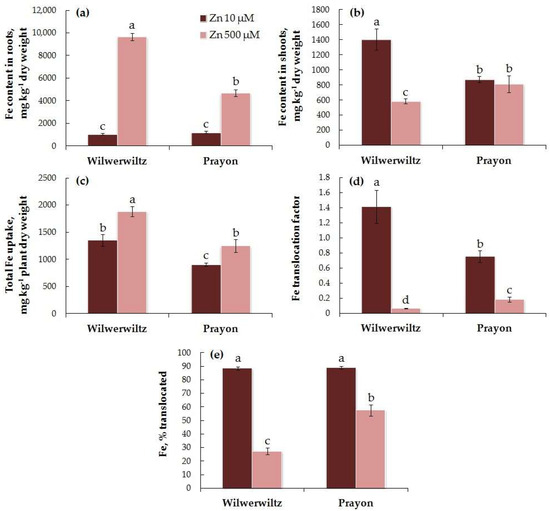 Figure 6. Iron contents in the roots (a) and shoots (b), total Fe uptake (c), Fe translocation factor (d), and % translocated (e) after 2 months of Zn treatment of Noccaea caerulescens (Wilwerwiltz and Prayon populations) (means ± SEs, n = 9). Values assigned with different letters indicate a significant difference between the means (two-way ANOVA followed by post hoc Tukey’s HSD test, p ≤ 0.05).