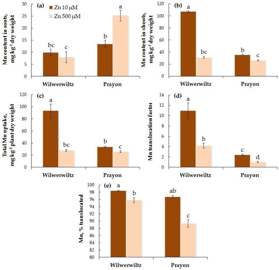 Figure 7. Manganese contents in the roots (a) and shoots (b), total Mn uptake (c), Mn translocation factor (d), and % translocated (e) after 2 months of Zn treatment of Noccaea caerulescens (Wilwerwiltz and Prayon populations) (means ± SEs, n = 9). Values assigned with different letters indicate a significant difference between the means (two-way ANOVA followed by post hoc Tukey’s HSD test, p ≤ 0.05).