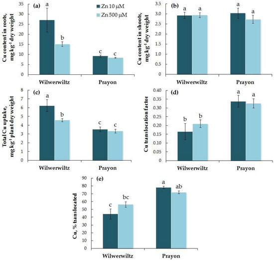 Figure 8. Copper contents in the roots (a) and shoots (b), total Cu uptake (c), Cu translocation factor (d), and % translocated (e) after 2 months of Zn treatment of Noccaea caerulescens (Wilwerwiltz and Prayon populations) (means ± SEs, n = 9). Values assigned with different letters indicate a significant difference between the means (two-way ANOVA followed by post hoc Tukey’s HSD test, p ≤ 0.05).