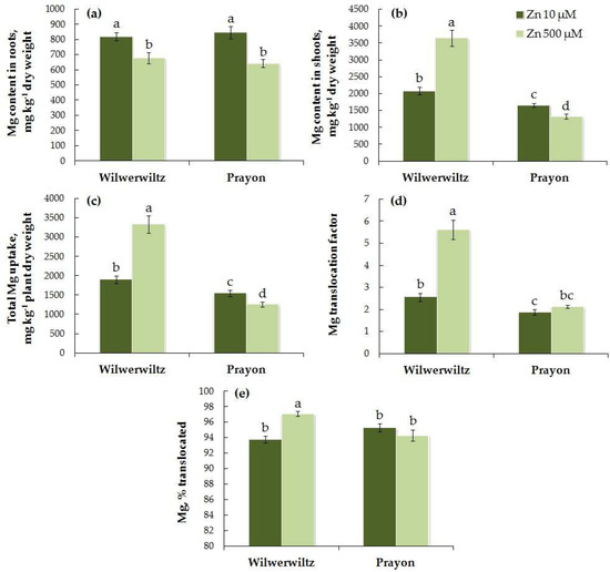 Figure 9. Magnesium contents in the roots (a) and shoots (b), total Mg uptake (c), Mg translocation factor (d), and % translocated (e) after 2 months of Zn treatment of Noccaea caerulescens (Wilwerwiltz and Prayon populations) (means ± SEs, n = 9). Values assigned with different letters indicate a significant difference between the means (two-way ANOVA followed by post hoc Tukey’s HSD test, p ≤ 0.05).
