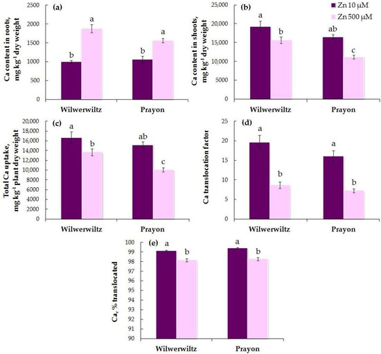 Figure 10. Calcium contents in the roots (a) and shoots (b), total Ca uptake (c), Ca translocation factor (d), and % translocated (e) after 2 months of Zn treatment of Noccaea caerulescens (Wilwerwiltz and Prayon populations) (means ± SEs, n = 9). Values assigned with different letters indicate a significant difference between the means (two-way ANOVA followed by post hoc Tukey’s HSD test, p ≤ 0.05).