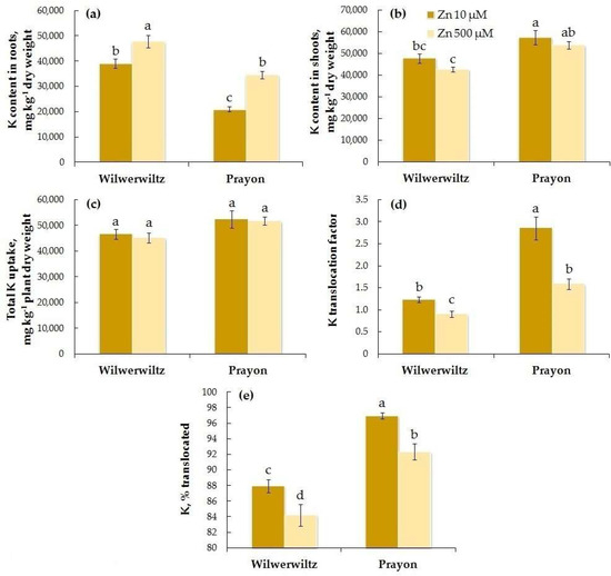 Figure 11. Potassium contents in the roots (a) and shoots (b), total K uptake (c), K translocation factor (d), and % translocated (e) after 2 months of Zn treatment of Noccaea caerulescens (Wilwerwiltz and Prayon populations) (means ± SEs, n = 9). Values assigned with different letters indicate a significant difference between the means (two-way ANOVA followed by post hoc Tukey’s HSD test, p ≤ 0.05).