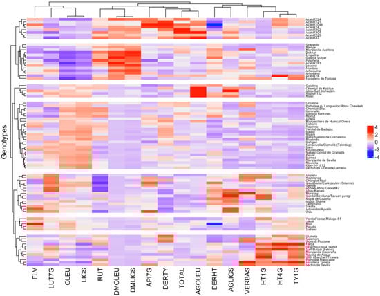 Hierarchical clustering heatmap of BLUP values for fruit phenolic components. TOTAL: total phenols, DERHT: hydroxytyrosol derivatives, DERTY: tyrosol derivatives, FLV: flavonoids, HT1G: hydroxytyrosol-1-O-glucoside, HT4G: hydroxytyrosol-4′-O-glucoside, DMOLEU: demethyloleuropein, OLEU: oleuropein, AGOLEU: oleuropein aglycone, VERBAS: verbascoside, TY1G: tyrosol-1-O-glucoside, DMLIGS: demethylligstroside, LIGS: ligstroside, AGLIGS: ligstroside aglycone, RUT: rutin, LUT7G: luteolin-7-O-glucoside, API7G: apigenin-7-O-glucoside.