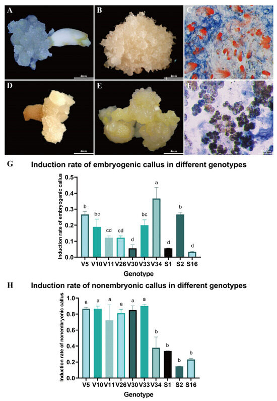 Callus Induction in Pinus elliottii. (A) Immature embryos inducing EC. (B) Embryogenic callus. (C) Acetocarmine-Evans blue staining of EC observed under electron microscopy. (D) Immature embryos inducing NEC. (E) Non-embryogenic callus. (F) Acetocarmine-Evans blue staining of NEC observed under electron microscopy. (G) Induction percentage of EC across different genotypes. (H) Induction percentage of NEC across different genotypes. Letters indicate significant differences among various treatments. p < 0.05. Bar: SE error bars.