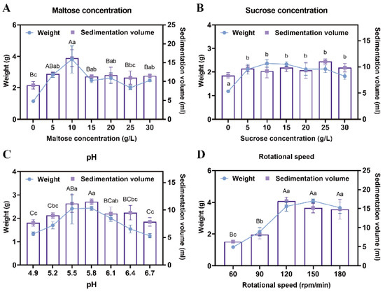 Screening of suspension culture conditions for Pinus elliottii embryogenic callus. (A) The effect of maltose concentration on the proliferation of EC. (B) The effect of sucrose concentration on the proliferation of EC. (C) The effect of pH on the proliferation of EC. (D) The effect of rotational speed on the proliferation of EC. Note: Uppercase letters indicate significant differences in the weight of EC between treatments, lowercase letters indicate significant differences in the sedimentation volume of EC between treatments, and treatments without letters indicate no significant difference. p < 0.05. Bar: SE error bars.