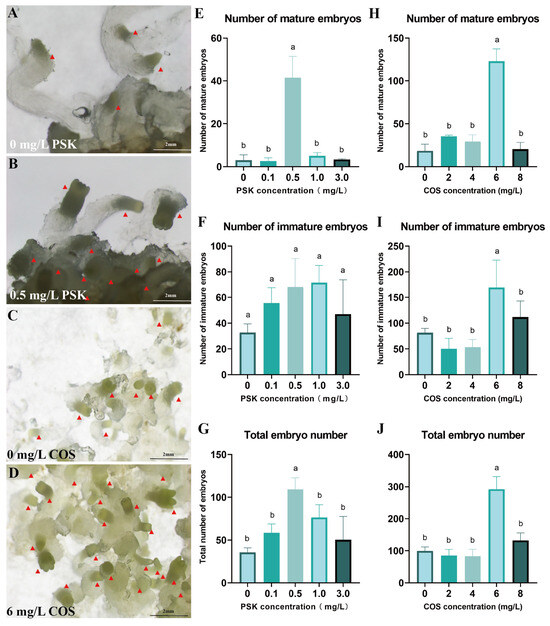 Optimization of conditions for somatic embryo maturation of Pinus elliottii. (A,B) PSK-induced mature somatic embryos; (C,D) COS-induced mature somatic embryos; (E–G) PSK-induced mature somatic embryos, immature somatic embryos, and total embryo count statistics; (H–J) COS-induced mature somatic embryos, immature somatic embryos, and total embryo count statistics. Letters indicate significant differences among various treatments. p < 0.05. Bar: SE error bars. Somatic embryos are marked with red triangles.