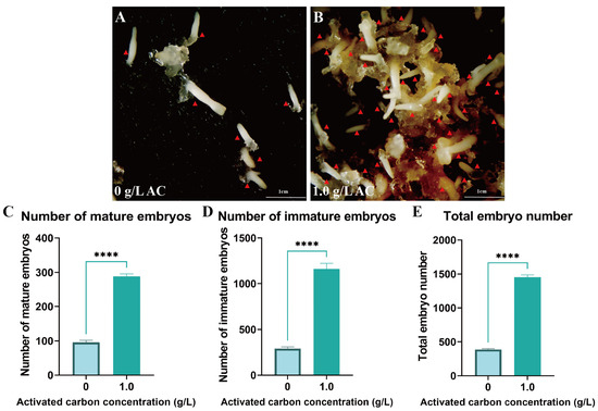 To further optimize embryogenesis efficiency, 1 g/L AC was supplemented to the medium. This treatment significantly improved somatic embryo maturation efficiency, inducing an average of 288.67 mature embryos per gram fresh weight of EC with a total embryo yield of 1452 (p < 0.05) (Figure 5A–E). Furthermore, AC supplementation significantly reduced the incidence of embryo browning through adsorption of phenolic compounds.