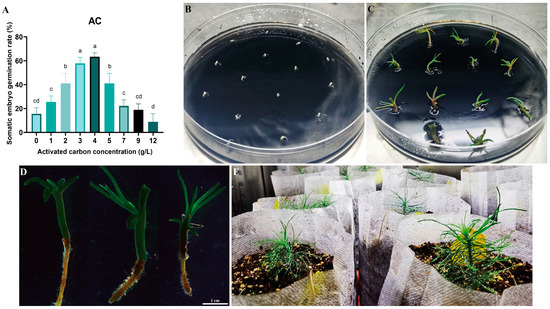 Somatic embryo germination and somatic embryo seedling transplantation of Pinus elliottii. (A) Effect of activated carbon concentration on somatic embryo germination; (B,C) induction of somatic embryo germination; (D,E) transplantation of somatic embryo seedlings to the greenhouse. Letters indicate significant differences among various treatments. p < 0.05. Bar: SE error bars.