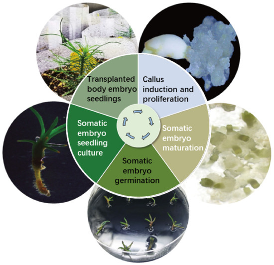 Schematic representation of the somatic embryogenesis technology system for Pinus elliottii.